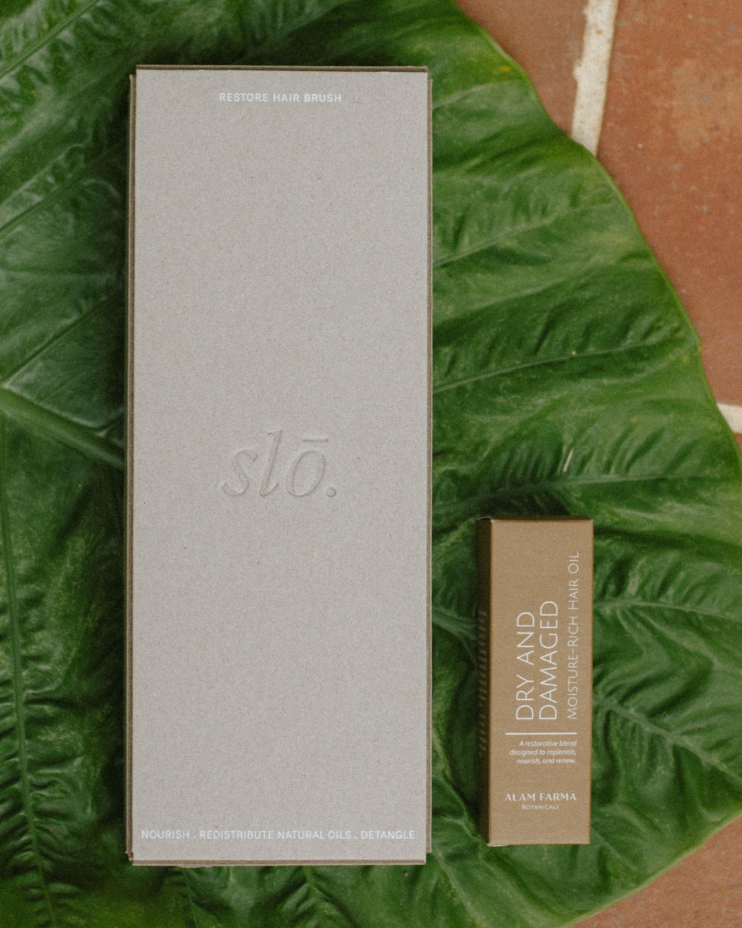Our hair oil nourishes and repairs at the scalp and fibre level, while the The Slō living dual-bristle brush stimulates circulation and evenly distributes the oil from root to tip for stronger, shinier hair.